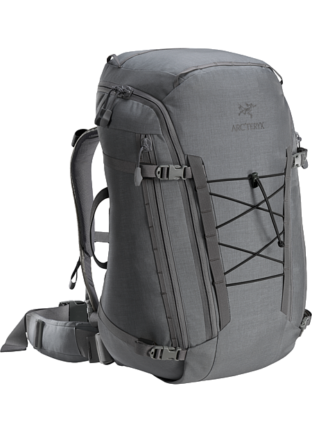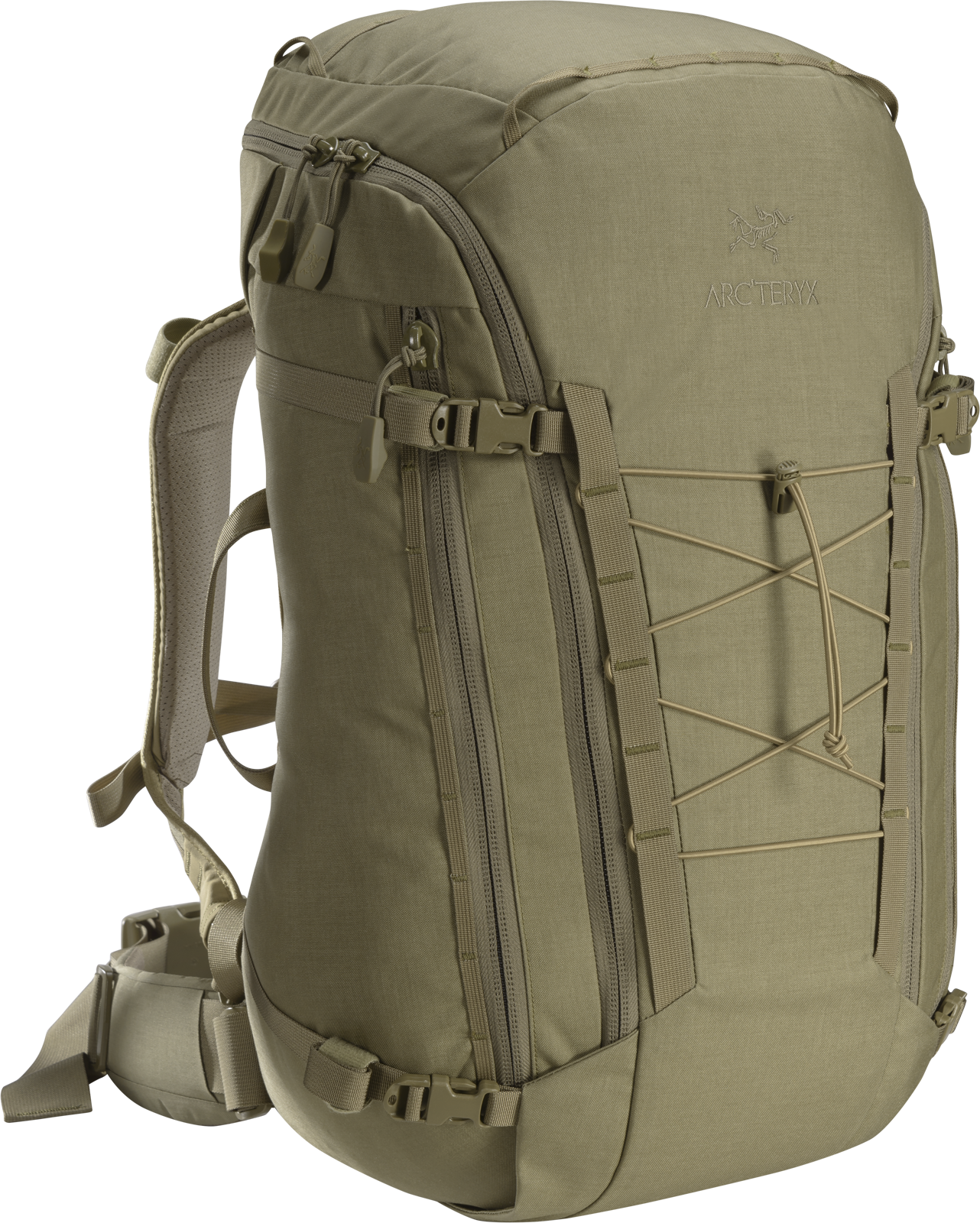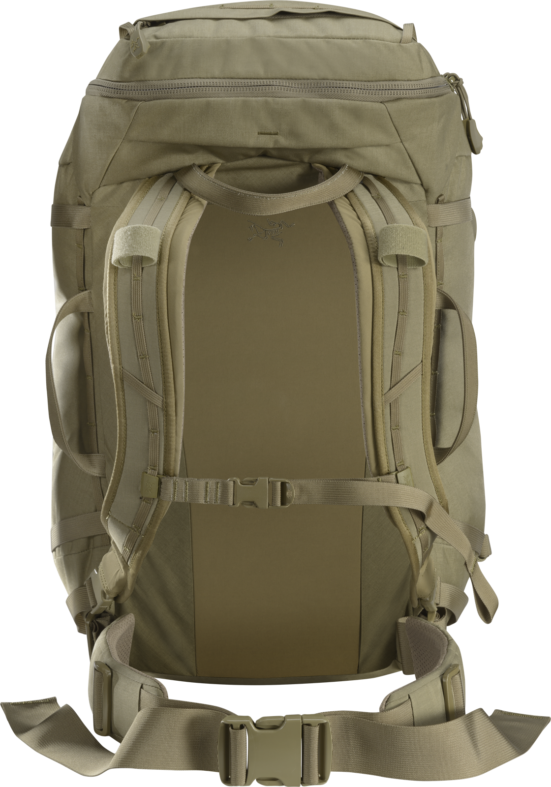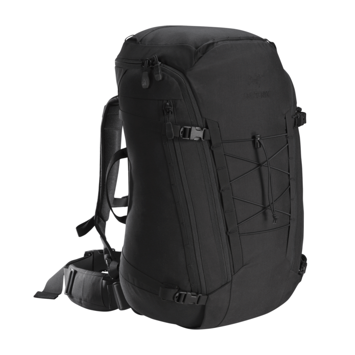 Arc'teryx LEAF updated 45 Liter pack is the Assault Pack 45. Fully padded, single compartment bag. Top lid has extended zippered pocket plus stash pocket and two zippered side pockets. Zipper closure opens from the top, side or unzips pack completely to reveal interior composite panels lined with Velcro® loops and daisy chains for versatile pouch/radio configurations or camera equipment. Radically light in weight C2 composite construction suspension system holds load tight and close to the body, avoiding shifts in weight to conserve energy. Velcro® One-Wrap® cable/hose management system and integrated hydration ports.