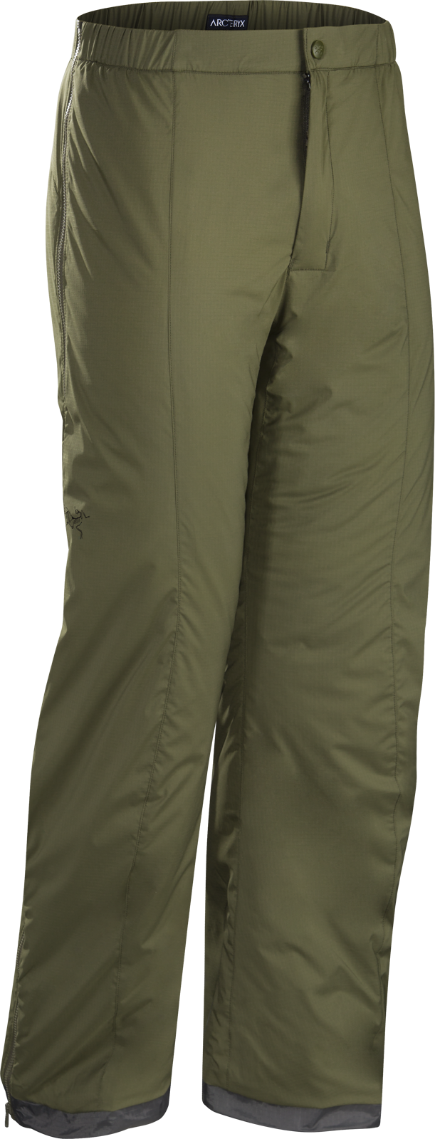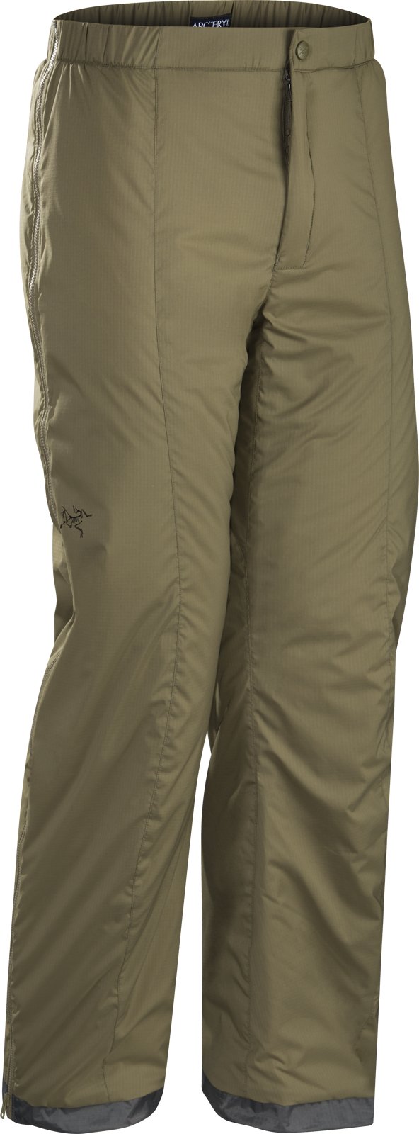 Arc'teryx LEAF Pack-able insulated cover pant. This is a mid-weight insulated pant with Coreloft synthetic insulation that retains loft for a long time. It has full zip sides to make it easier to put on with boots and gives you a venting option. This is a great item to layer with a hard shell like the Alpha Gen 2 Pant.