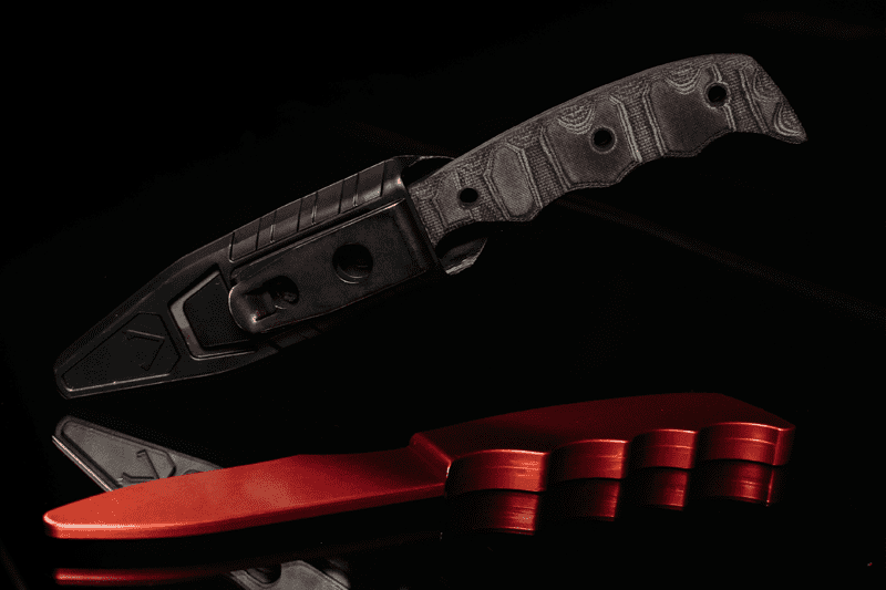 The Dynamis Blade was designed for on and off duty use. Inspired by Warriors through their collective experience in close quarters battle and combatives. The blade is cut from CPM3V, one of the toughest, most wear resistant steels on the market. The overall cutting edge is 3.75″ and is offered in a single or double edge. The customized and sculpted micarta handle is a perfect fit for both reverse and forward grip fighting. The full grip is ideal for both bare and gloved hands. For added grip, jimmping was placed on the thumb ramp, under the hilt, and on the pommel. The Dynamis blade is an easily concealable combative blade that transitions seamlessly to a professional working environment. *SHEATH & RED TRAINER INCLUDED