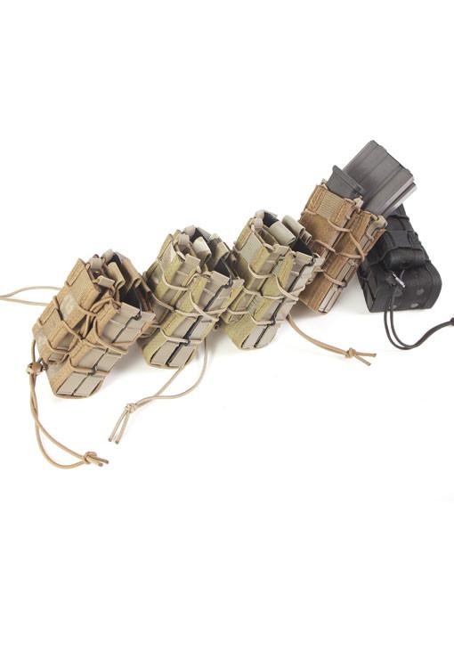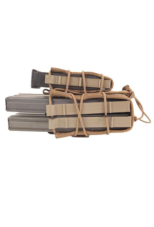 All pouches are constructed from Cordura, injection molded polymer and shock-cord. The pouches maintain a positive, adjustable grip on the magazine and don't require any additional securing. Webbing tabs are sewn in on the top for the optional use of "over-the-top" bungee retainers (not included). Loop Velcro is sewn into the inside of the rifle TACO for the use of adhesive backed hook velcro on the magazine if the user wishes.